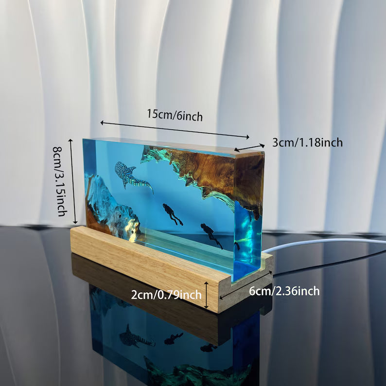 Dive into a serene underwater world with this captivating, handcrafted resin art light. Featuring a majestic whale shark gliding through crystal-clear waters alongside a diver, this piece captures a moment of oceanic wonder. The scene is expertly preserved within luminous, high-clarity resin, which comes alive when placed upon its minimalist wooden base. With a simple touch, warm light springs up through the resin, creating a stunning, ambient glow that transforms any room into a tranquil oasis.